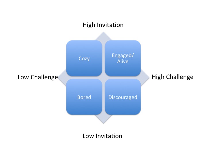 It might seem that Thomas is challenging Jesus while Jesus invites Thomas to believe. But a closer look reveals that Jesus’ invitation to believe is essential to the the implied but very real challenge to live as a disciple. If you don’t have the invitation to faith you don’t have a basis for living for Jesus. But if you don’t have the challenge to live for Jesus your life will be anything but abundant! Consider this diagram: