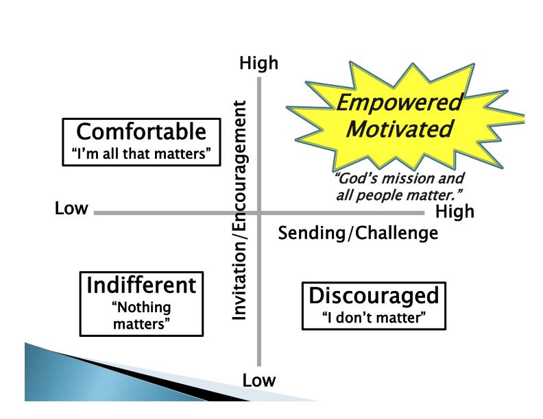 We are teaching this dynamic this week through this illustration of Invitation/Encouragement – Challenge/Sending. When the invitation/encouragement is high and the challenge/sending is also high we have breakthrough Christian discipleship life. We realize that God’s mission and all people matter. We want to live this out in real and personal ways.